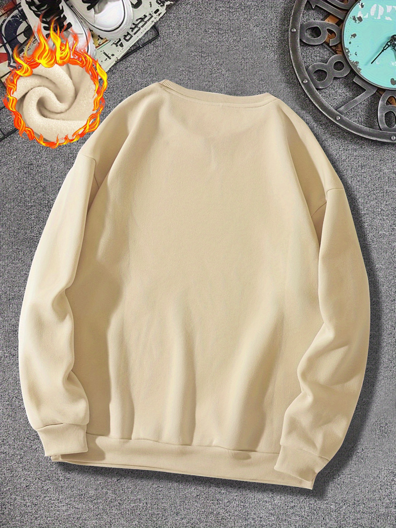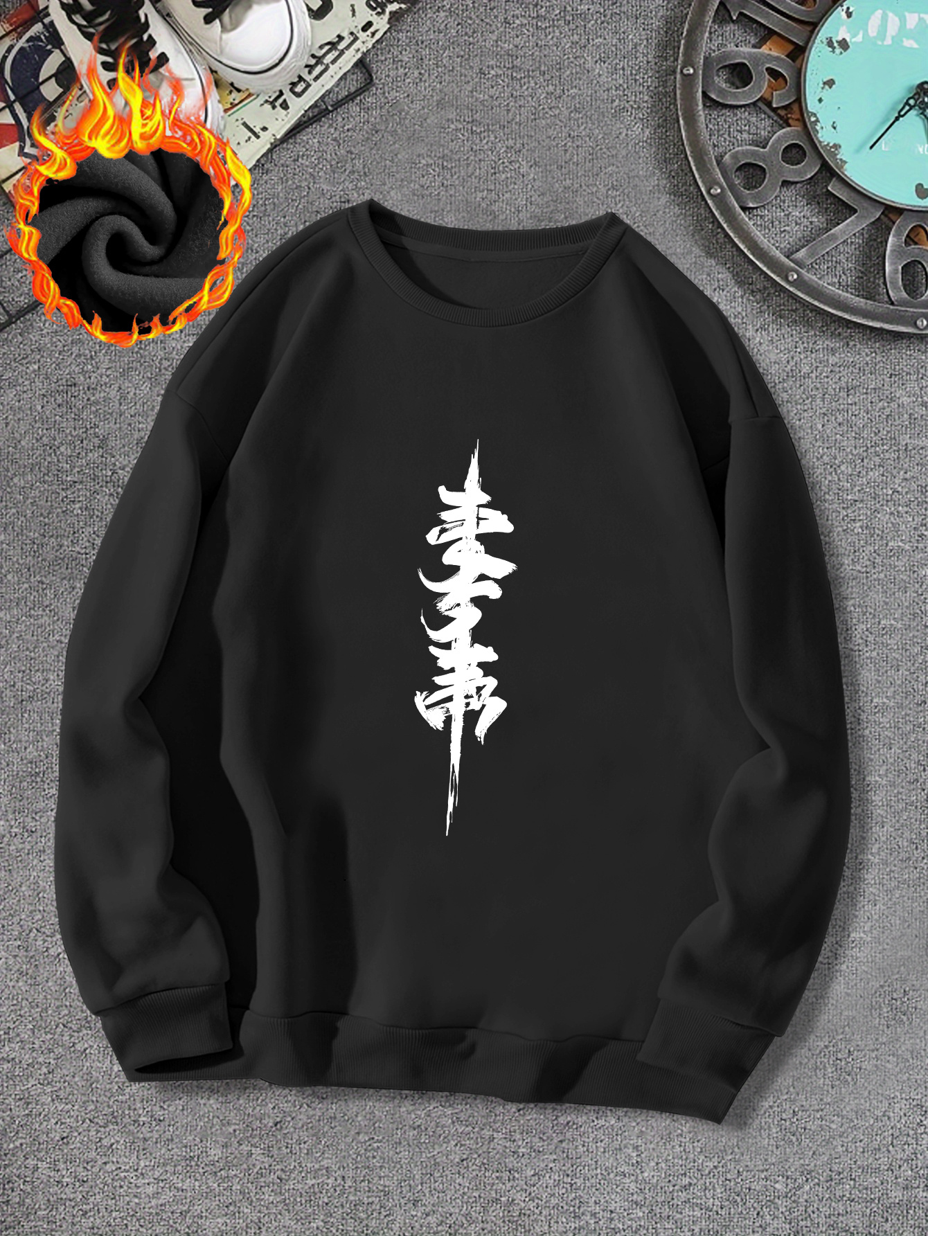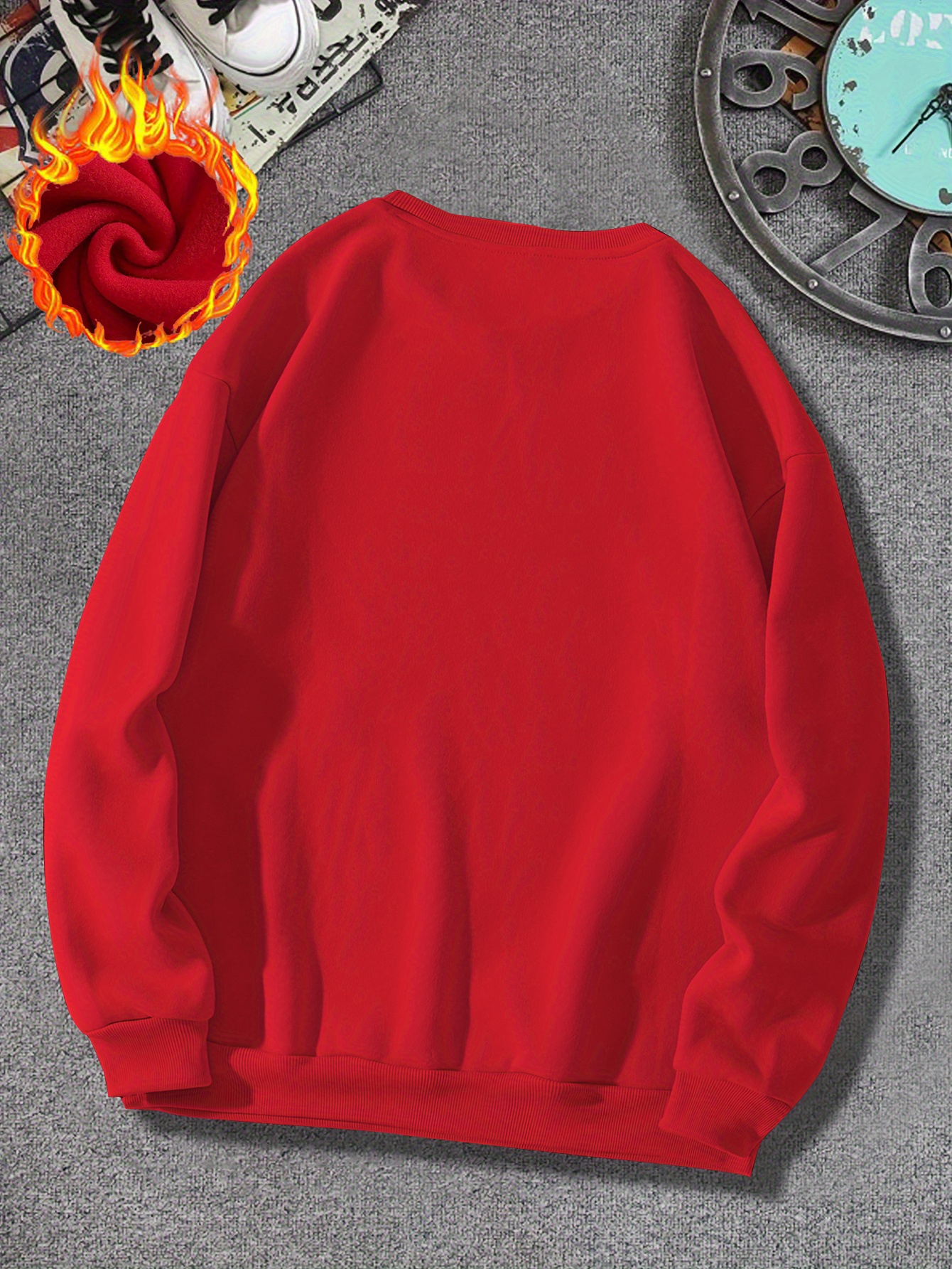 Men's Thick Fleece-Lined Winter Knit Sweater - Red with White Asian Calligraphy Print, Loose Fit Round Neck Casual Pullover, Machine Washable, Knit Sweater, Cozy Warm Clothing, Soft Texture Apparel