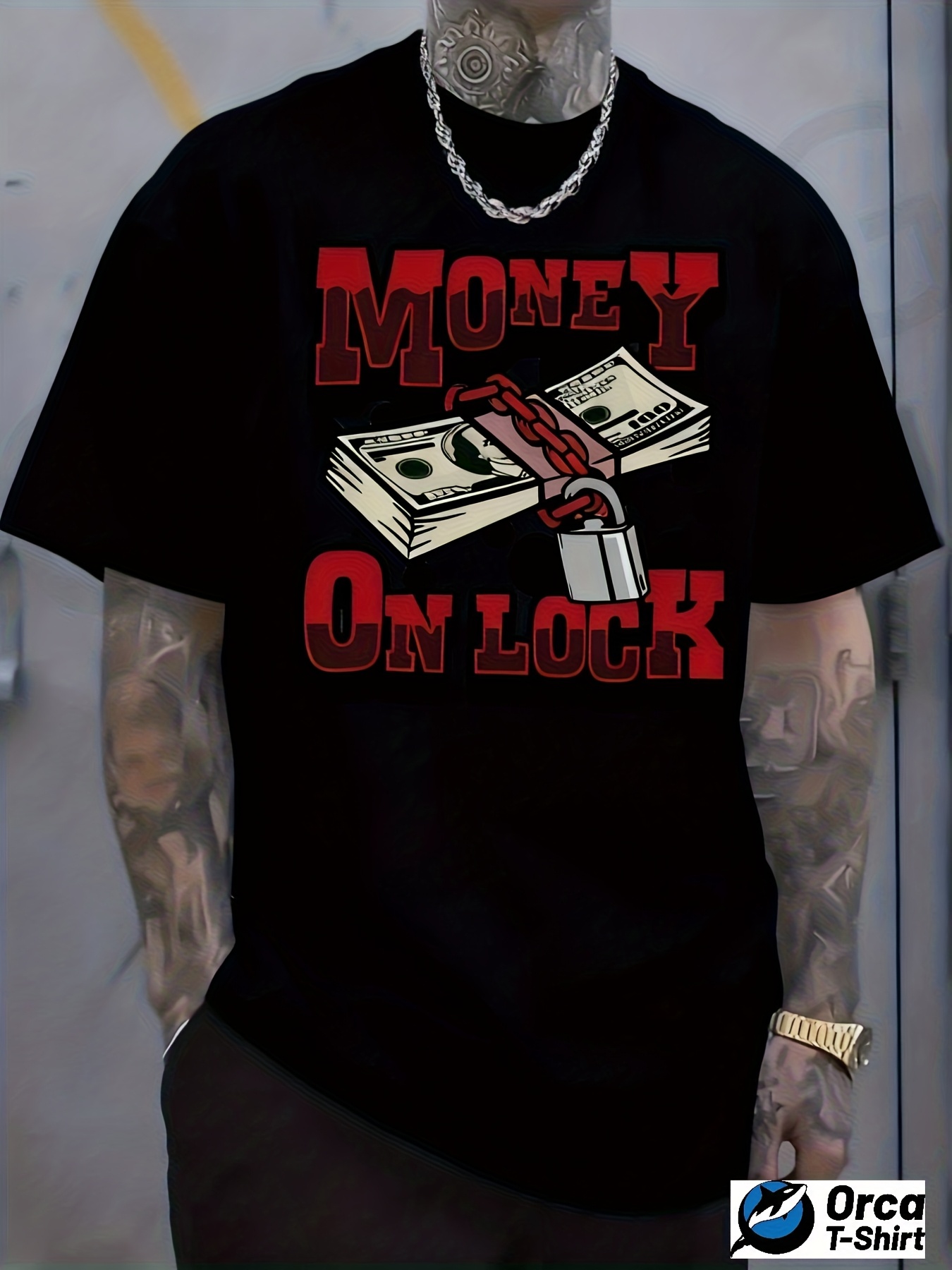 Men's Casual Graphic T-Shirt - Vibrant Red "MONEY ON LOCK" Design with Dollar Bills & Chains, 100% Cotton Regular Fit Short Sleeve Tee, Machine Washable All-Season Comfort Top