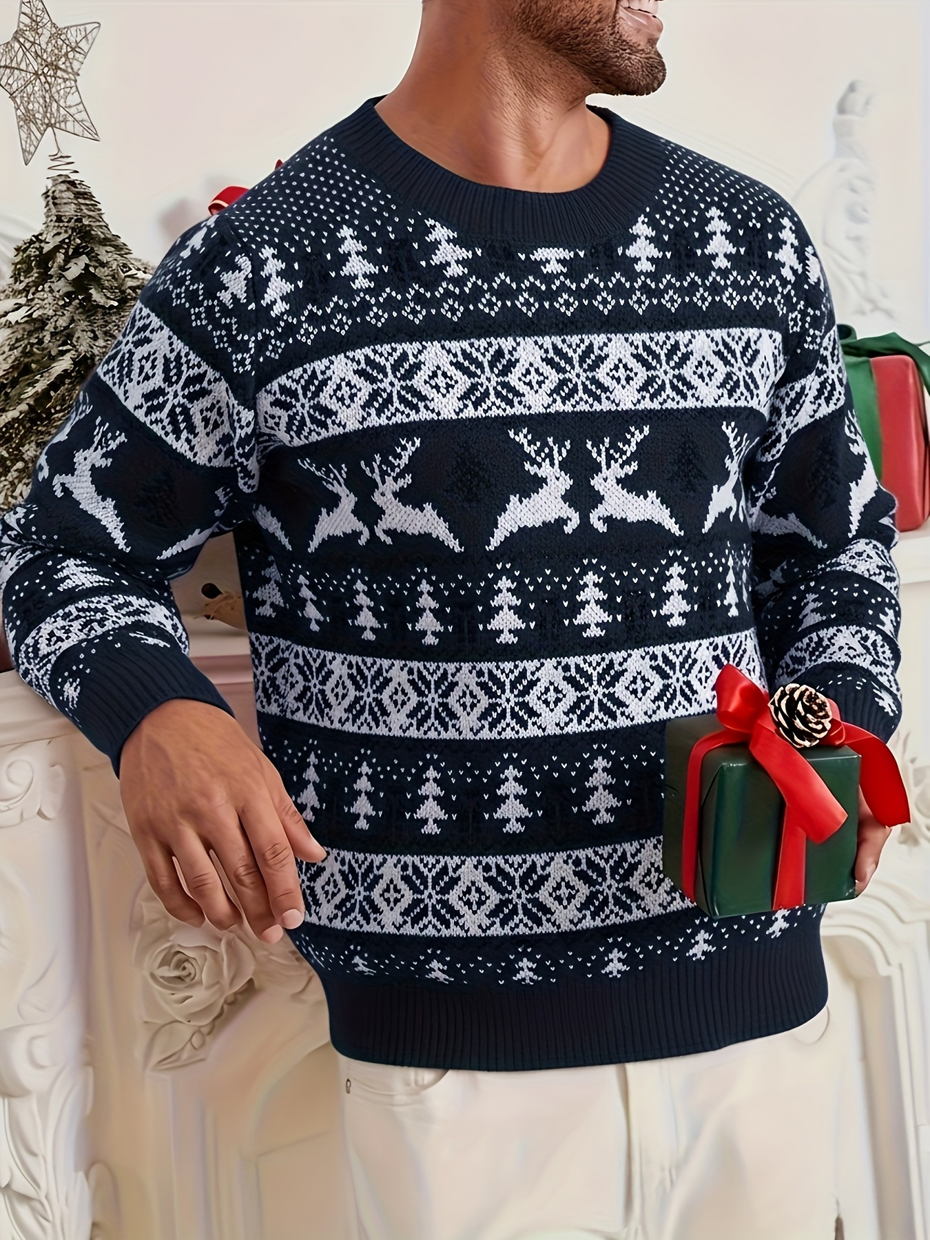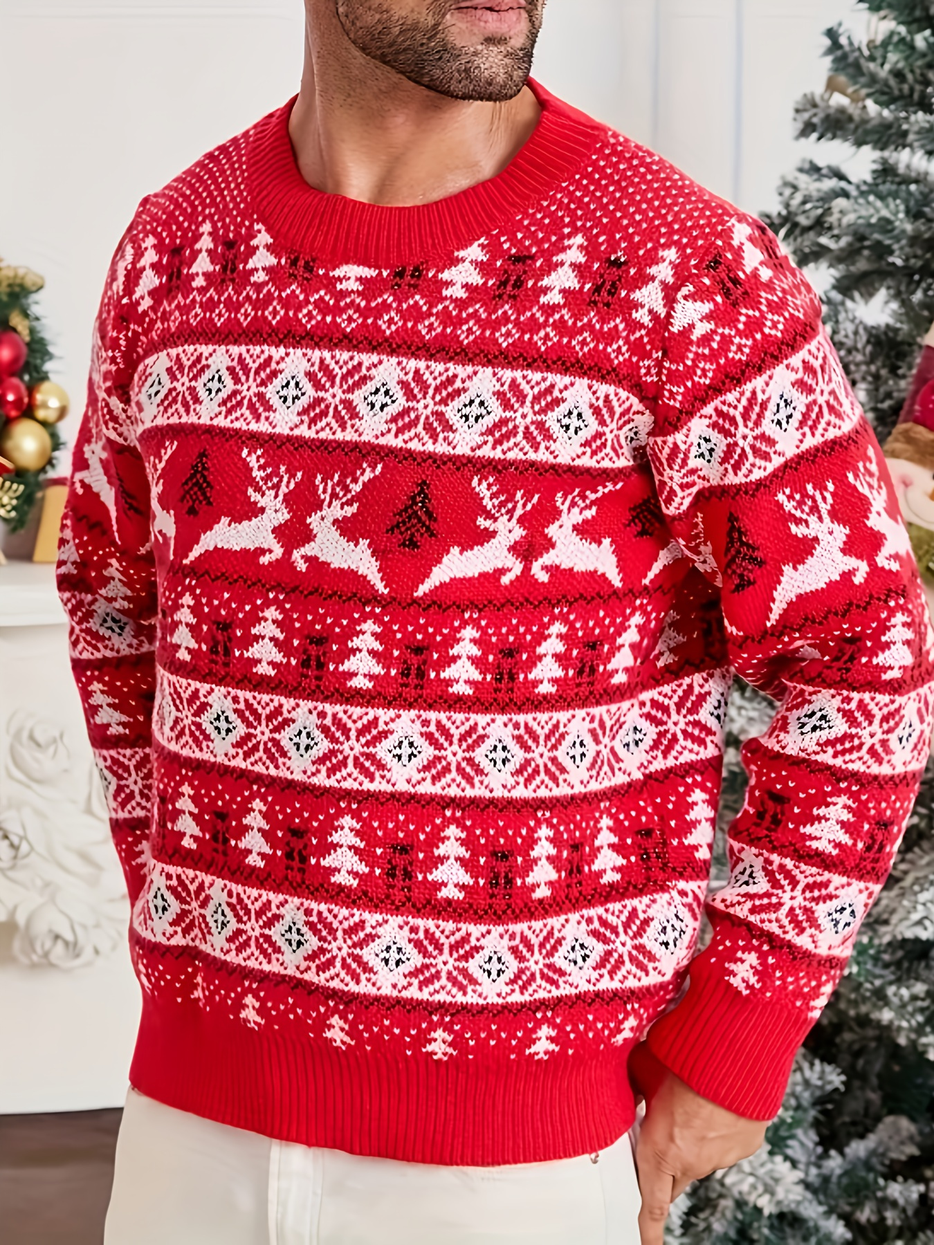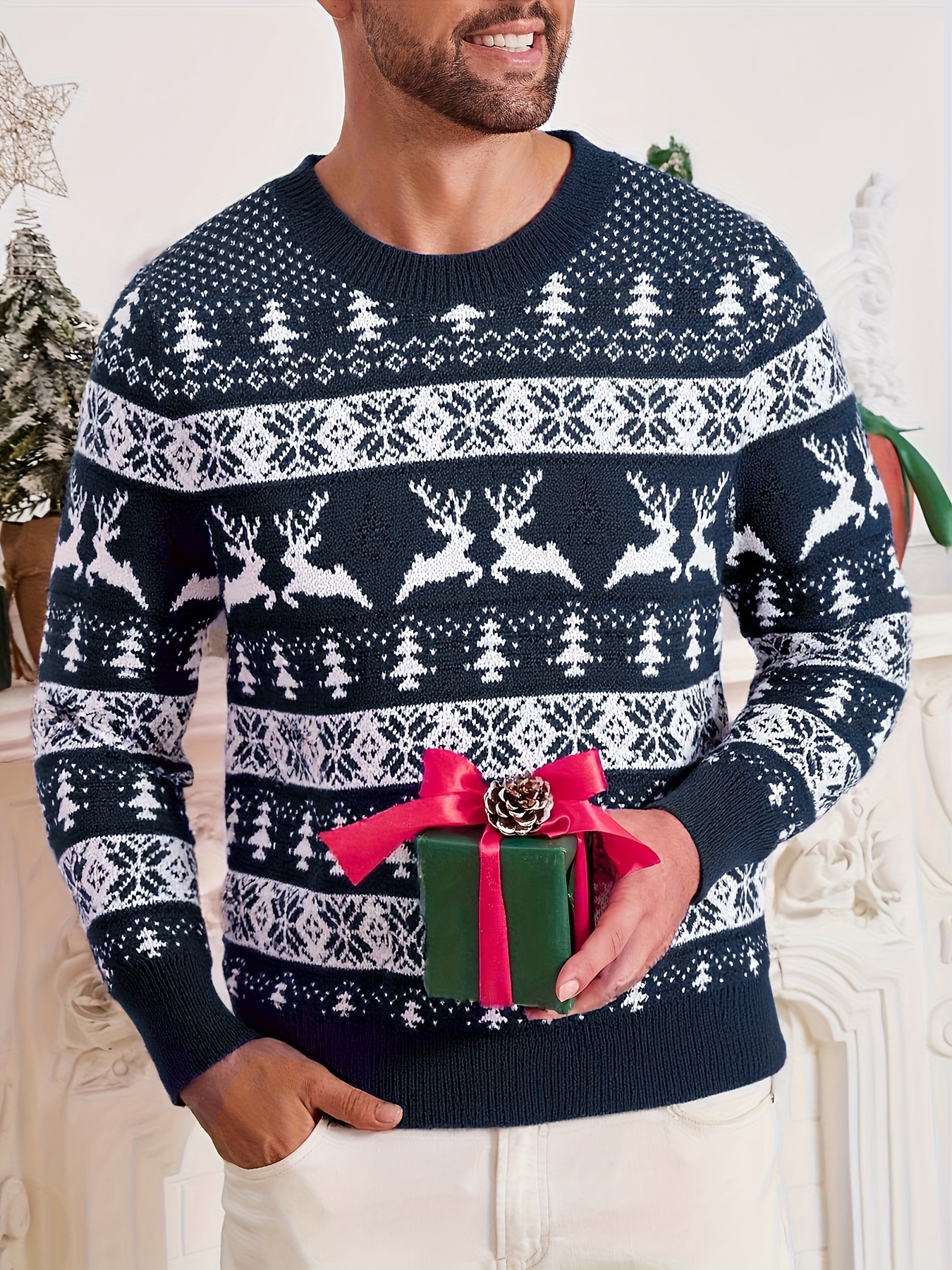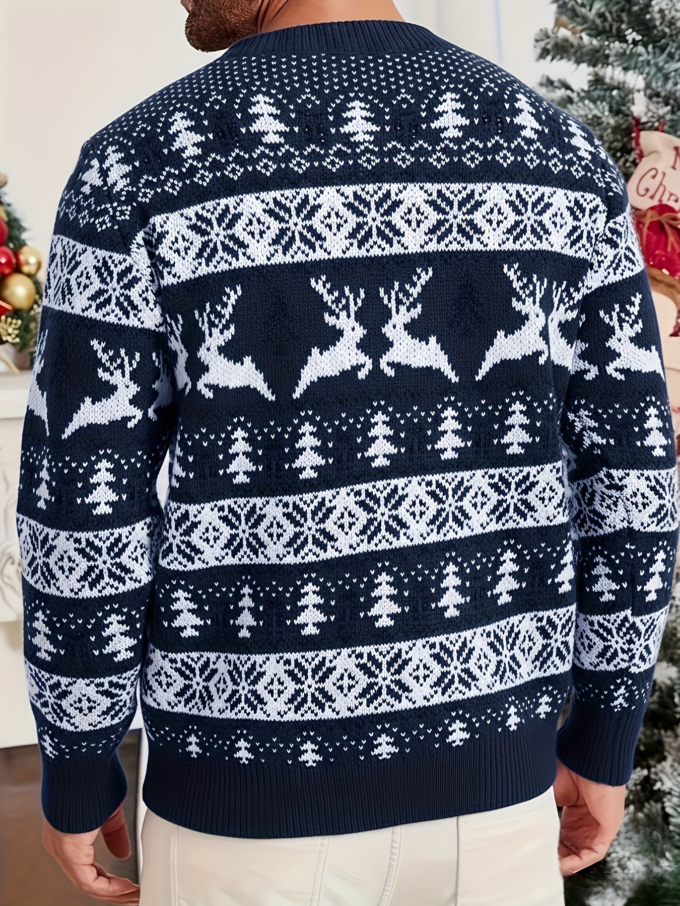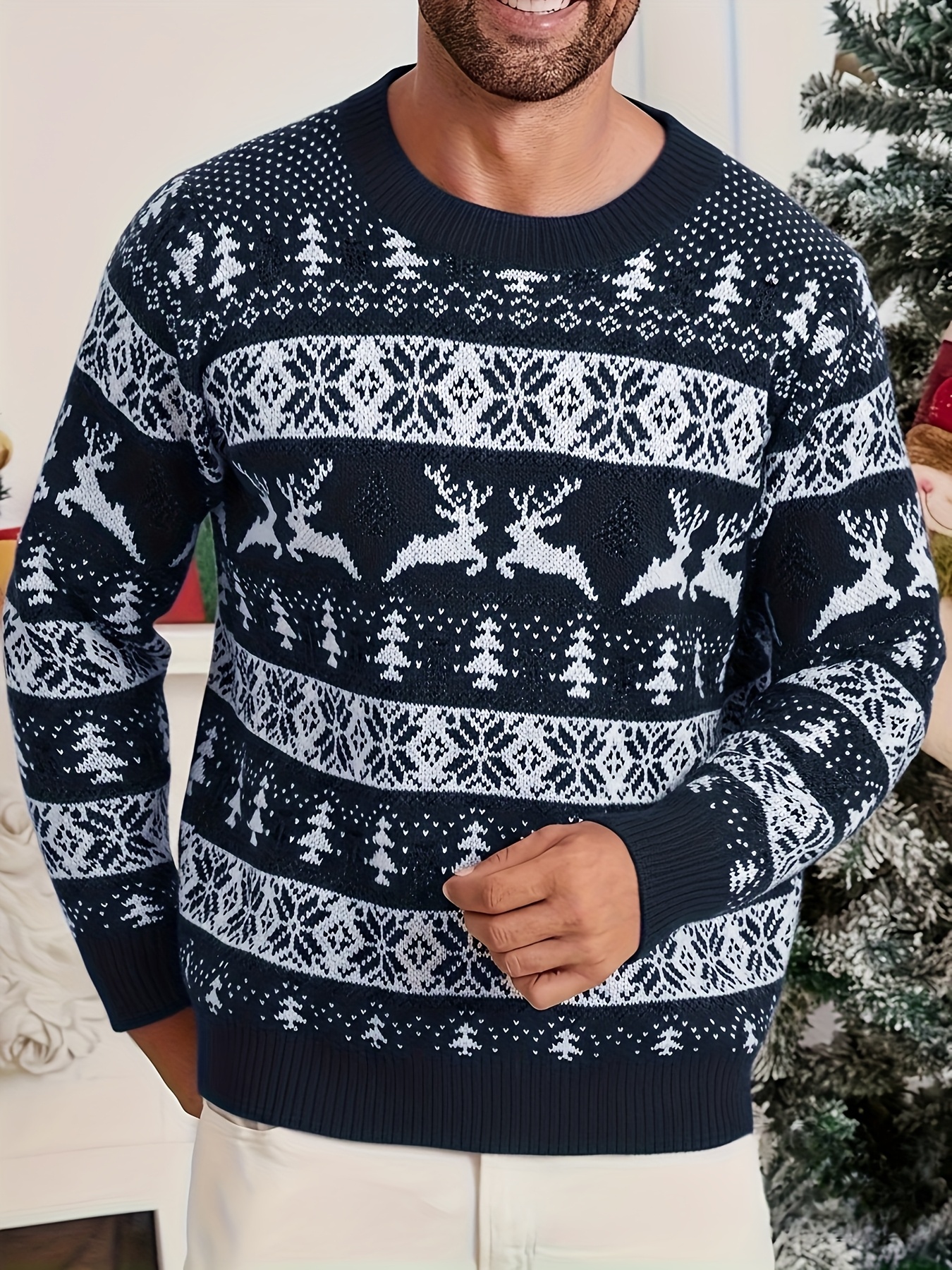 Men's Christmas Knit Sweater - Loose Fit Round Neck Pullover, Traditional Holiday Party Attire, Winter Wedding & Xmas Party Outfit, Cozy Autumn/Winter Sweaters for men, Christmas Gift (Hand Washable)