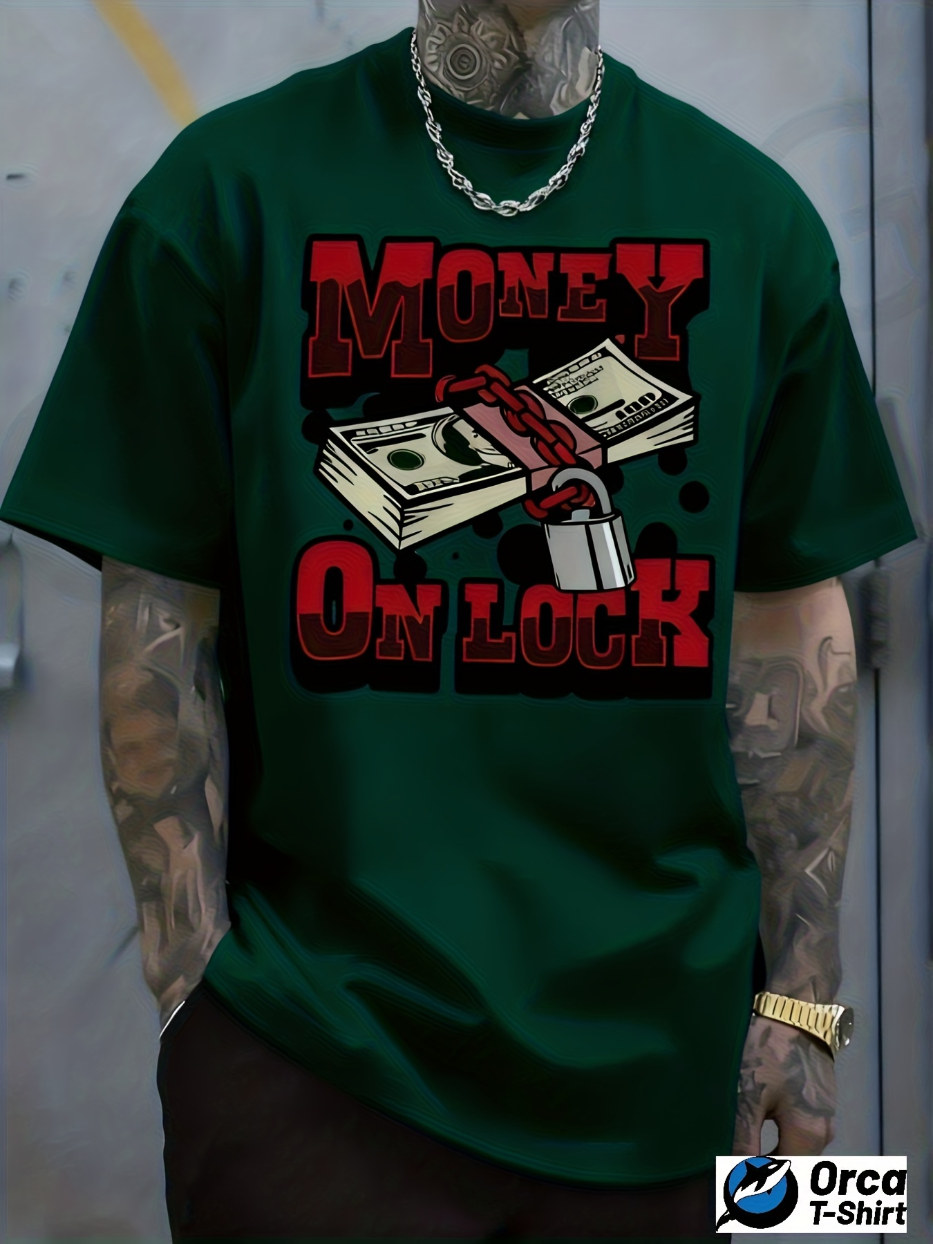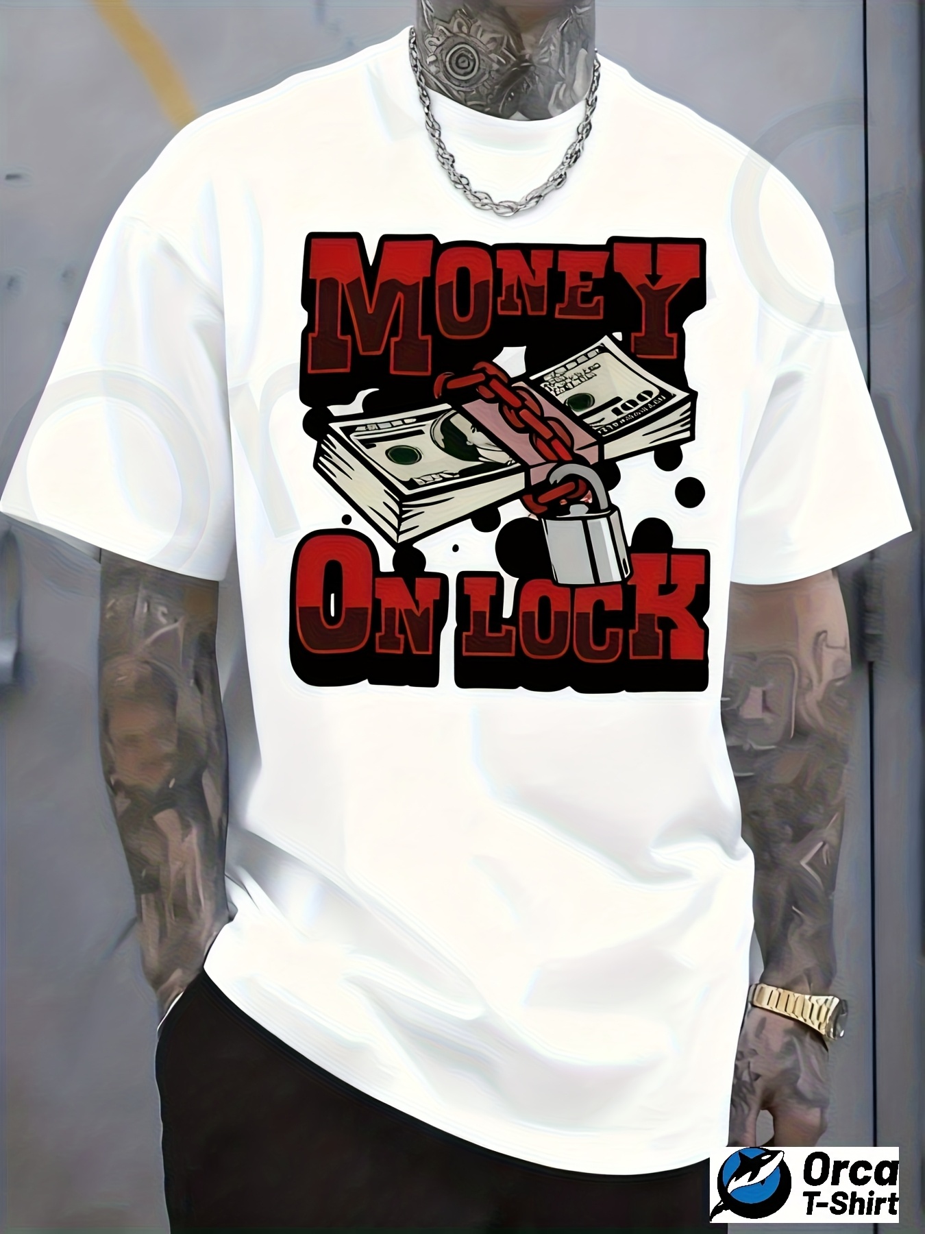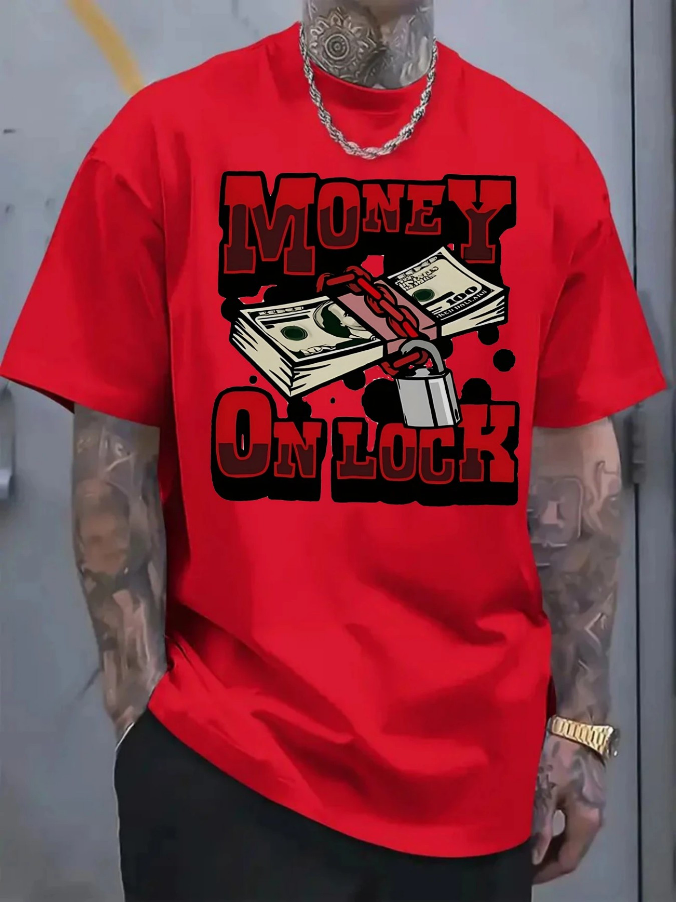 Men's Casual Graphic T-Shirt - Vibrant Red "MONEY ON LOCK" Design with Dollar Bills & Chains, 100% Cotton Regular Fit Short Sleeve Tee, Machine Washable All-Season Comfort Top